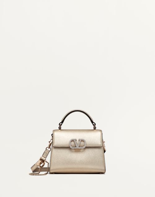 Borsa a mano mini Valentino Garavani in vitello granato metallizzato e chiusura VLogo Signature ricoperta di Swarovski®. La borsa può essere portata a spalla/cross body grazie alla tracolla estendibile, e a mano grazie al manico.- Logo e parti metalliche finitura platino- Chiusura magnetica con logo- Tracolla in pelle con elemento catena regolabile- Piedini protettivi- Fodera in nappa. Interno: tasca piatta aperta-Altezza (luce) tracolla: min 45,5 cm - max 59 cm - Dimensioni: W19xH13xD9 cm- Made in Italy