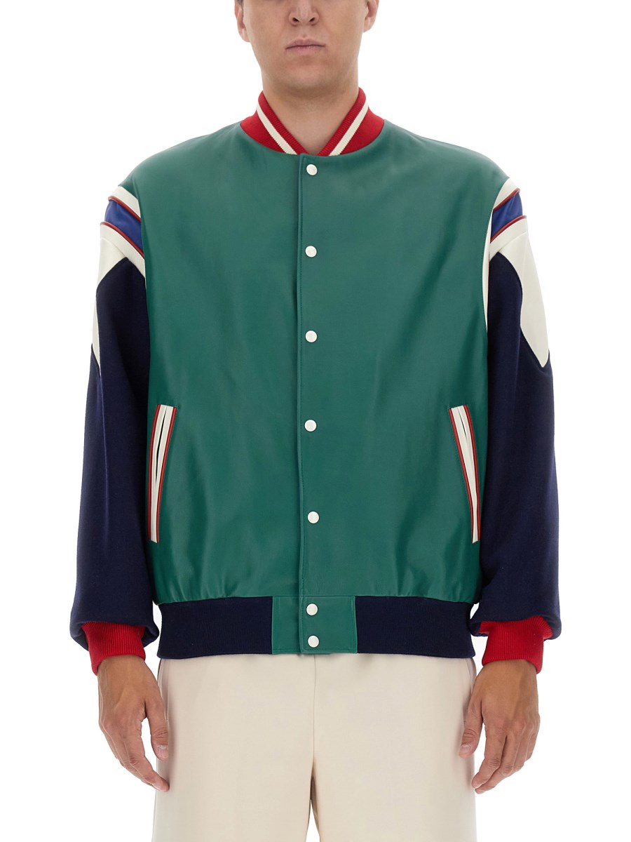 Sportiva e retrò, l'interpretazione di Gucci dell'activewear è all'insegna della raffinatezza quotidiana. Questo bomber rilassato è realizzato in pelle lucida verde e blu ed è arricchito da un intarsio di stelle "Gucci Loved" sul retro.